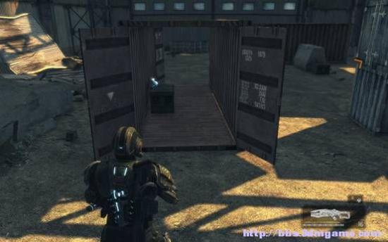 下了电梯捡起一个火箭筒,就往右边的一个两边通的箱子冲,在里面卡机器人,红血了就往后退后边的拐角有子弹,火箭筒。磨死机器人后,拿起火箭筒开门到水边