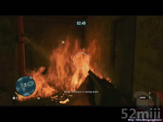 6.有3分钟的倒计时,时间比较充裕,不用着急,用枪打破水管可以灭火。