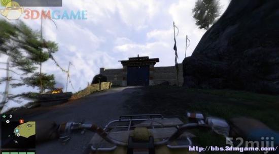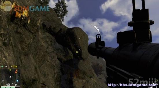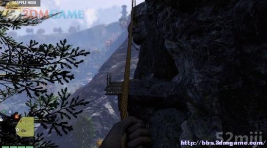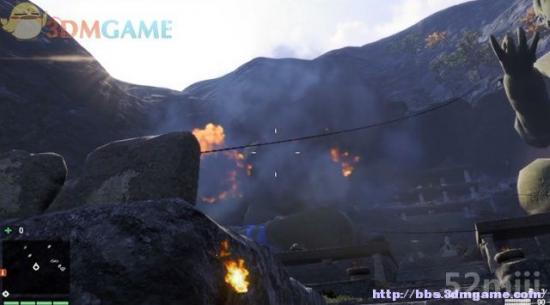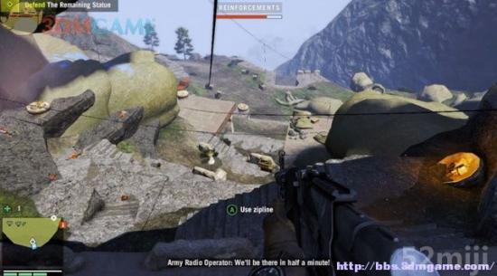 带上火箭筒,用滑索下去后往左边的山崖走,这里有条木制的栈道。用火箭筒朝那块摇摇欲坠的巨石来一发,滚落的石块会将道路给封住。