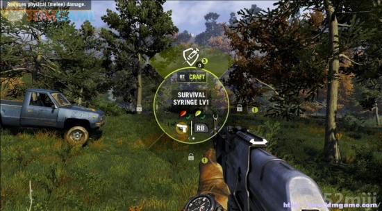 在武器轮开启的时候,按下RB键切换到制作轮盘,这里有4种针剂可以制作。如果你这里都是锁头,需要到技能菜单学习相应的象系技能来解锁。
