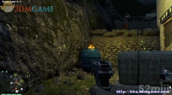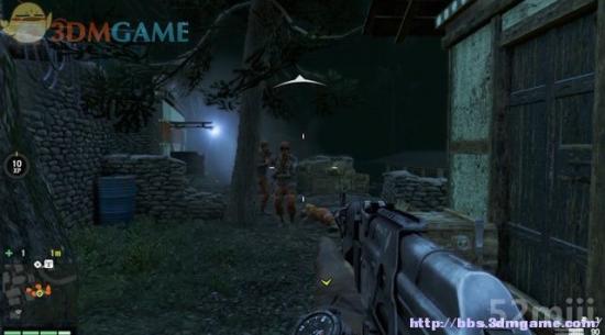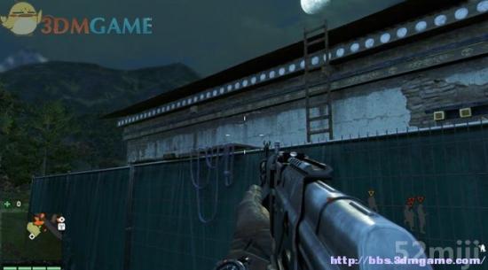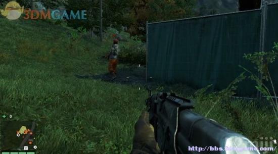 往村庄的左侧潜行过去,绕到主建筑的后方,这里有名徘徊的士兵,扔石块引到围墙后,由背后暗杀。
