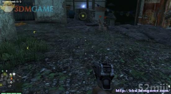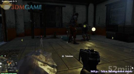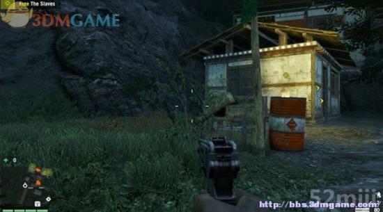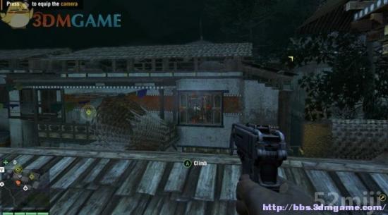 当前有3名村民需要解救。由开始的停车场往左边的墙壁攀爬上去,标记一下前方的敌兵,再由屋后的通道过去,继续往上层攀爬。