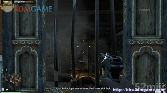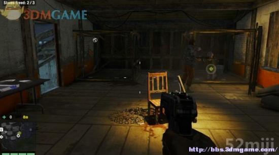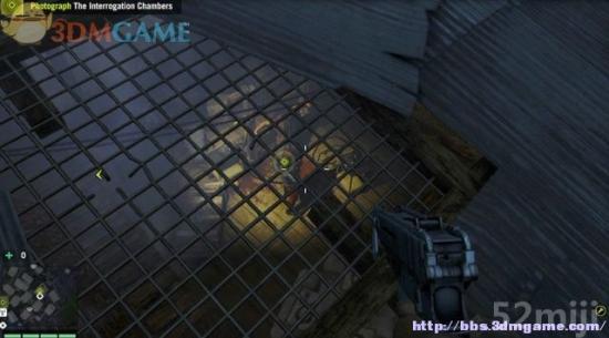 避开敌兵赶到另一间审讯室,村民被缚在一只铁笼里,士兵在旁边拍照。杀掉士兵后释放第三名村民。