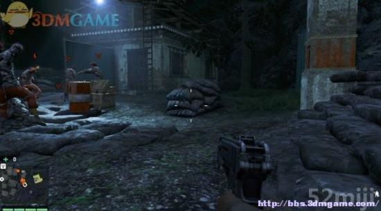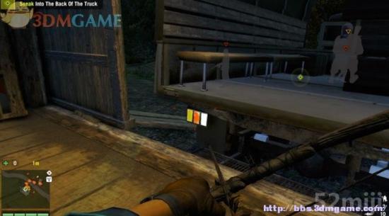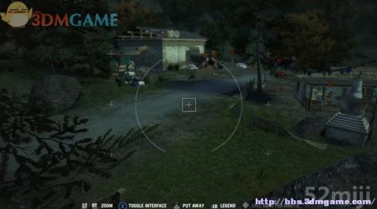 先蹲到村庄附近的石头上标记下敌兵,他们不是重点,目标是要爬上那辆卡车,这里的敌人都不用杀。