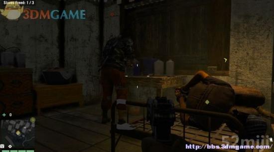 前往下一间审讯室,途中的敌兵很少,只有一名士兵爬到岗楼上,不用理会。进到屋里,看到市民被缚在床上,一名士兵在收拾桌上的刀具。背后刺杀士兵,释放第二名村民。
