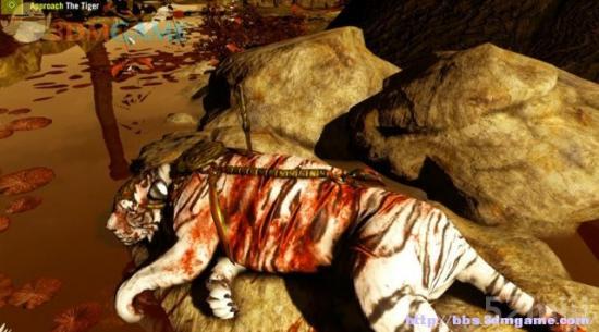 爬到岸边,眼前就是香格里拉。循路前行,在水洼边找到一只负伤的白虎,从它身上拔出一把锈迹斑斑的弯刀,白虎忽然消失了。