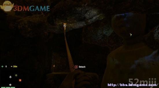 地下的洞腹里有一只坐像,洞穴各处有一些锚点,用绳索依次攀爬到高处平台。空中有道石梁,用绳索荡到坐像的左侧平台。
