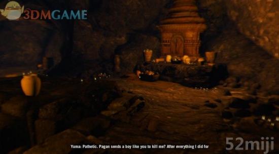 进到废弃的黄金矿井,在地上有几张纸条。跳进一间石室,这里有尊猛虎雕像,桌上摆着发霉的果蔬和糕饼。调查桌上的一张字条时,尤玛出现了,朝他轻轻的吹了口气,一股粉红色的烟雾吸入鼻管,阿基登时陷入恍惚和迷离中。