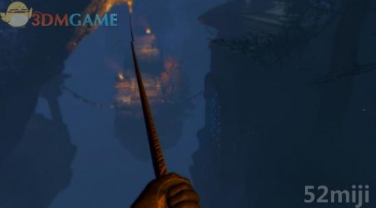 走到血河的末端,抬头找到锚点,用绳索攀爬上去。