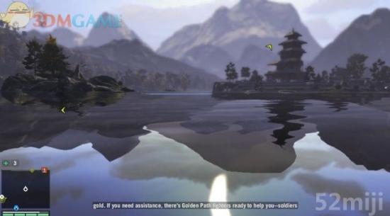 和瑟巴路线的任务一样,由山顶滑索到一座桥上,杰伦都神庙就在前方的那座小岛上,需要游泳过去。湖中会有敌人的巡逻艇,看到它就潜至水底,避开敌人的目光。