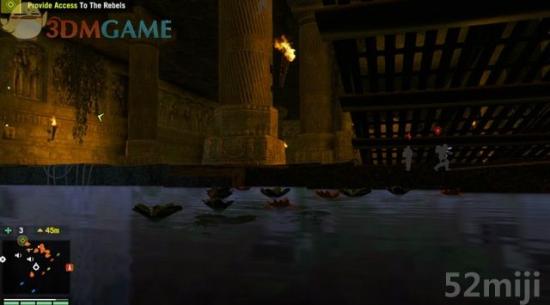 当前的任务是与前来援助的游击队员会合。进到地宫,前方的大厅里有两名守卫,其中一名是重装火焰兵,这里不要惊扰他们,趁其不备跳入水池中,潜游到大厅后部的水面,也就是斜桥这里。