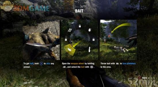沿河右岸行进,途中会遇到死掉的山羊,这里学习剥皮获取诱饵。打开武器轮盘选择诱饵,扔出诱饵能够吸引附近的食肉动物。