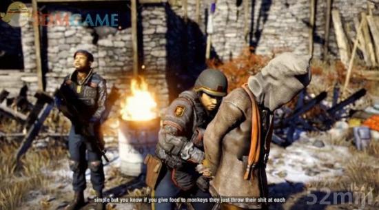 桥梁这里有多种策略通过,在桥左边有群逗弄野兽的士兵,等他们靠拢扔枚手雷过去。或者扔诱饵引野兽发狂,它会袭击附近的士兵造成混乱。
