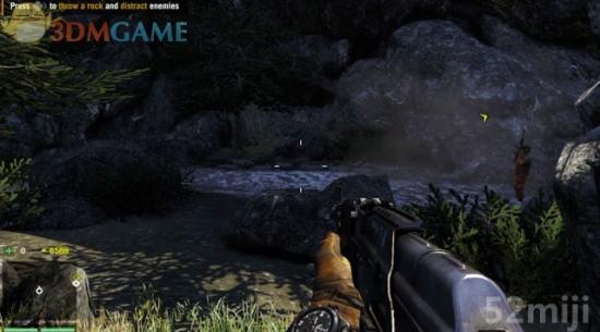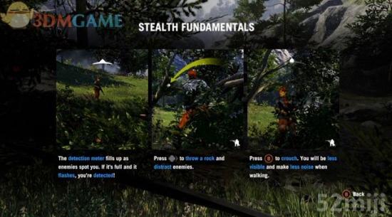 现在学习一下潜行模式,当下蹲姿式行进能够降低敌人的可视度,并减轻行走的噪音,不容易被敌人发现。朝敌人的附近扔石块,可以转移敌人的注意力。每名敌人的头顶都有侦测计量表,当白色充满表明敌人已经发现你的存在。