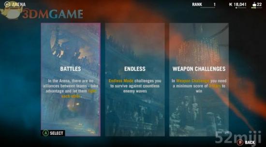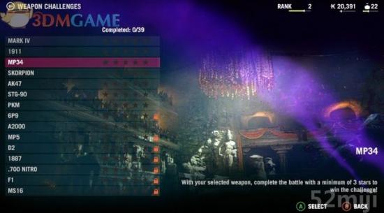 第三种是武器挑战(Weapon Challenges),选择一种适用的武器来挑战五个回合,通过杀死敌兵或猎物来获取点数,最后的表单会根据点数给出该武器的星数。