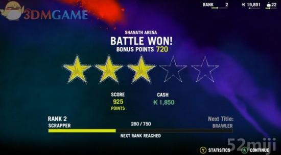 战斗结束,进入统计表单,显示获得的点数、评价和称号等。