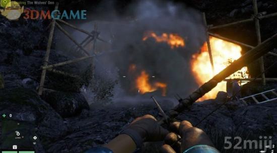 赶到狼巢附近,朝那两只狼射箭,它们会转身躲到狼巢里去。来到狼巢入口,这里貌似废弃的矿井,注意洞里面有只油桶,射箭引爆它。轰隆一声狼巢被彻底摧毁,狼群再也不会骚扰农场了。