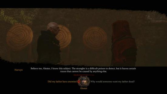 而在谈话的最后HARWYN也表示对于ALESTER父亲死的怀疑,ALESTER父亲的死亡可能是其弟弟GAWEN的谋杀;但是这一切还只是单纯的怀疑,并没有任何实质的证据