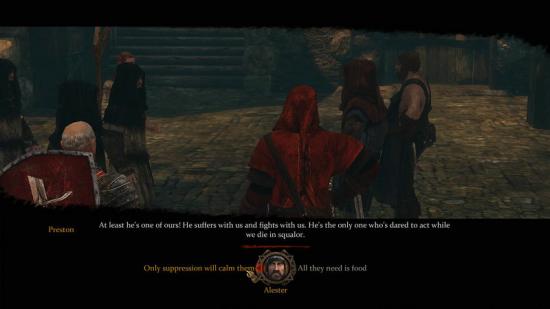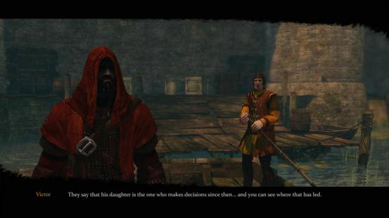 然后来到南部的码头处,这里有四个待处决的市民,他们因为种种罪行现在而待被处决。你可以询问守卫或者市民来试图找寻其中的真相,但是无论如何 你还是得选择是放市民走还是处决