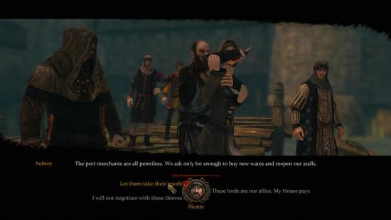 沿着北部的路来到码头可以看到一个暴民正在劫持一个贵族,你可以依据对话选择是让贵族给他珠宝放了她还是直接干掉这个暴民