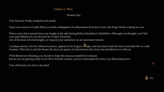 面对此次任务的委托者JON ARRYN的死,GODRIC和MORS以及JEOR都有些不知所措。但是在老朋友的情谊下,MORS觉得还是继续来帮助GODRIC一行人