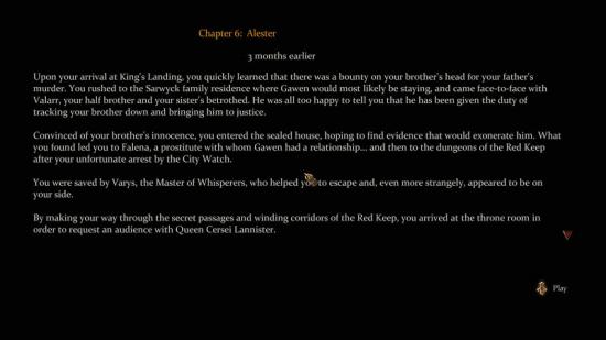 但是VALARR已经先进一步,ALESTER正准备离开王座前往北部的时候。其父亲的好友HARLTON邀请他来到自己在首都的宅邸一叙,而且称自己有其弟弟GAWEN的重要消息