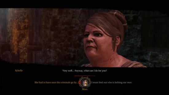 一路追踪发现这些人居然藏匿在MOLE 'S TOWN的旅馆里面。同门口的老板娘对话,查询这些收买NIGHT WATCH银币的下落。得知在旅馆的下层房间有一批人在用这些银币在玩艺术交易
