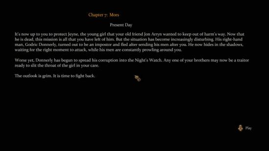 MORS决定带着JEYEN先到自己妻子和女儿的隐藏农场先躲避一时。沿途的营地休息中,MORS讲述自己为何被放逐到NIGHT WATCH的缘由,以及对妻女的想念之情