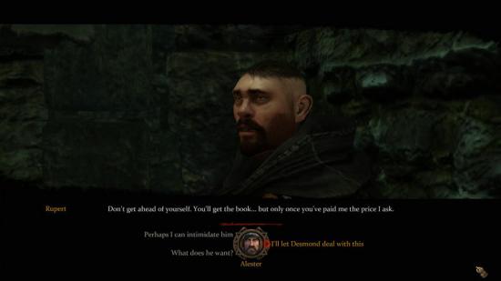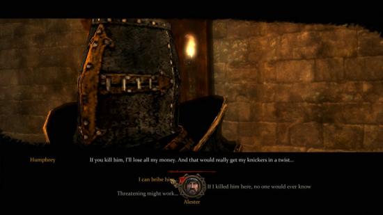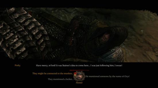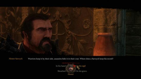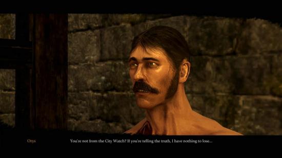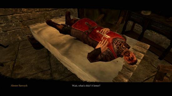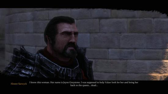 ALESTER悲痛的发现GAWEN被严刑拷打致死的尸体,悲痛欲绝。然后同一旁的处刑卫兵对话,花125银币收买到REAPER头目的审问权