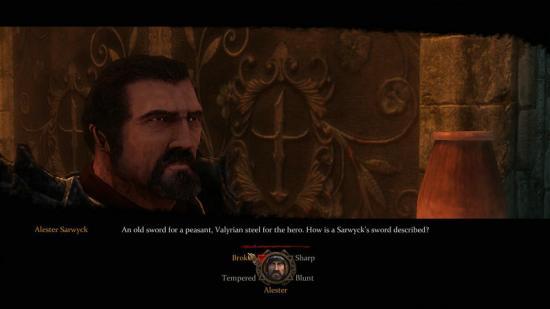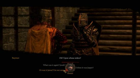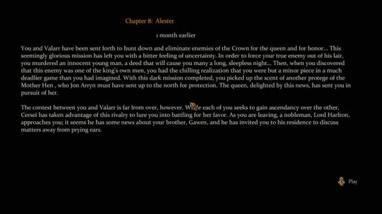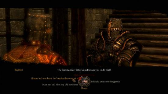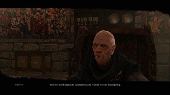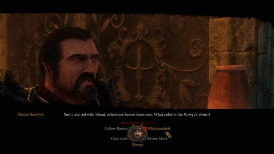 回到RIVERSPRING的城堡,同王座上的ELYANA对话。ALESTER告知GAWEN的死是由VALARR一手造成的,ELYANA极其震惊。ALESTER同时询问ELYANA父亲秘密文档的下落
