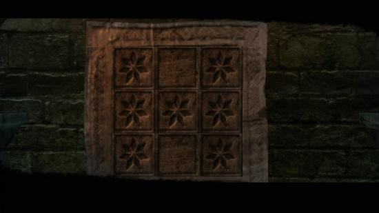 下一个谜题比较简单。整个区域不是由诸多九宫格模式内的符号的壁画组成的么。在转动最下面的转盘的时候,按照每个九宫格内的符号数目对应转动相应的数字转盘即可