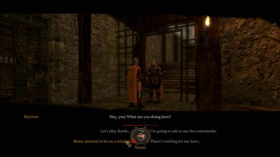 进入到兵营,从守卫的话中得知新关押的囚犯在右边的下层地牢下面。按照下图对话选择,选择左上的选项蒙骗守卫进入到下一层