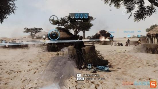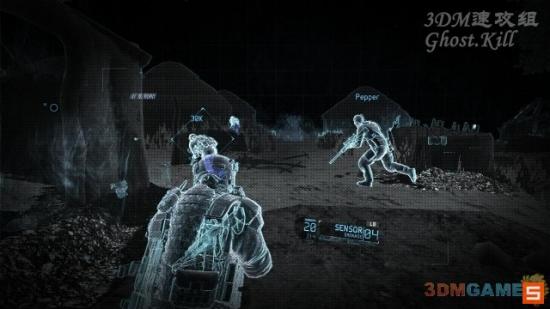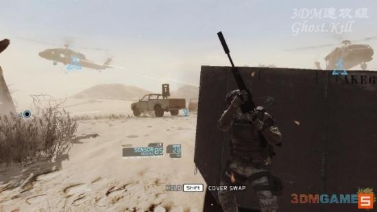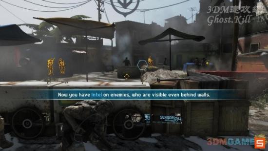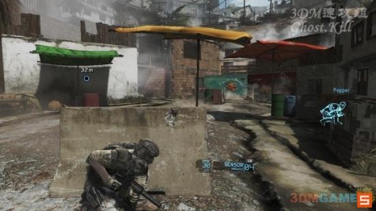 装备好武器后开始任务。首先来到图中位置,按空格键找掩体,然后按F向敌人附近扔一个传感器,传感器可以标记周围肉眼看不到的敌人,数量有限,时间有限,不可回收。看到周围全部敌人后杀
