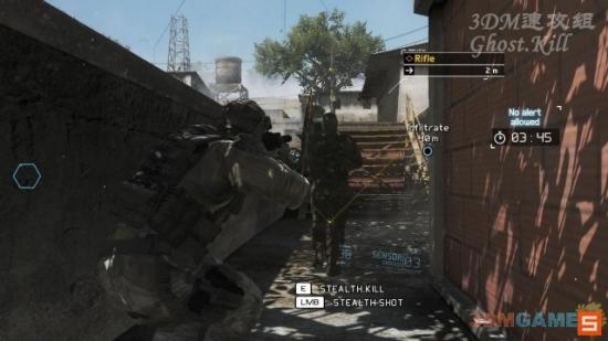 来到敌人背后有两种方法暗杀,一是按E过去扭断对方脖子,二是直接打爆他脑袋,效果差不多,动作不同,我个人更倾向于第二种,比较帅。干掉他之后上去前边的楼梯,建议使用掩体移动,被发现的几率更小,路上还会遇到一个人,直接枪杀或者过去暗杀都可以,直接不被发现就行。