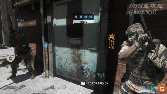 进入卷帘门中,爬梯子上楼,楼上的房间里可以听到敌人在谈话,往屋里扔一个传感器,然后站到门口,按E破门而入,类似COD那种慢动作,杀光里敌人后开门来到室外。