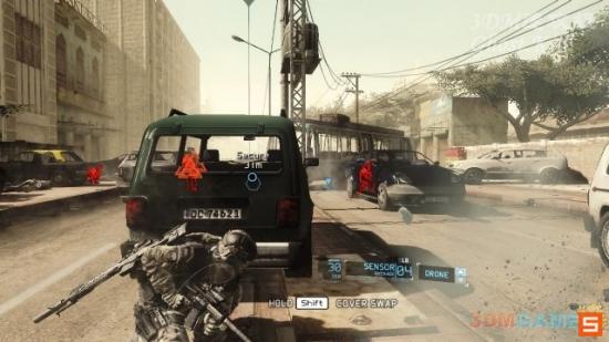 接下来来到大街上,这里开始是使命召唤流冲锋陷阵,敌人很多,使用传感器查看位置。小心那些