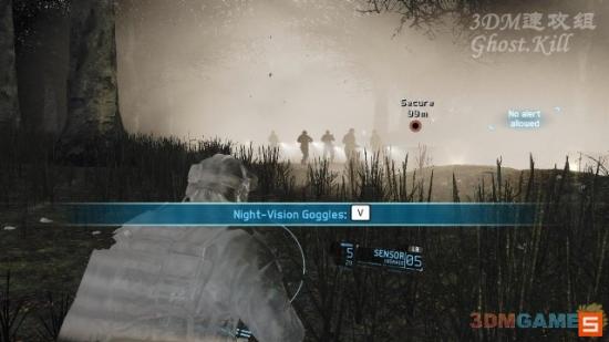 夜间潜入敌人基地,先干掉树林里的两个敌人,按V可以使用夜视仪,不过没太大必要。等待敌人