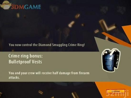 9:夺取葛拉纳多斯和托尼家族的一个犯罪集团(Take over 1 of their crime rings) 要夺取一个犯罪集团,得拿下城中所有的同类场子,大地图上用相同的图标标识,在成年人娱乐(Adult Entertainment)、赌博(Gambling)、洗钱(Money Laundering)、钻石走私(Diamond Smuggling)和军火走私(Gun Running)中任选其一,由于钻石走私只有三个场子,并且可解锁防弹衣,建议夺取这个,确定后在教父模式下的地图上逐个设定目标攻取吧。