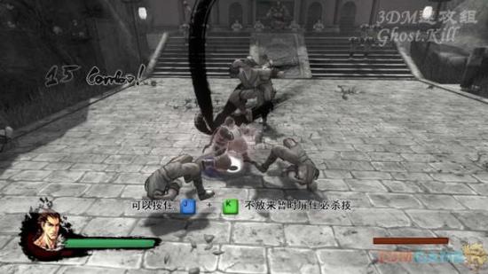 杀完杂兵后BOSS跳了出来,按L滚动躲开BOSS的攻击,也可以按空格防御,防御不要一直按着,等被击中前的瞬间再按,时机不好掌握,这BOSS还是滚着躲开吧。