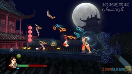 屋顶战,开始的两个BOSS不难打,也是一有机会就吸血,等快干掉的时候出杂兵,都是扔飞镖的,杀光之后会来用飞针的BOSS,连续一串飞针过来是必杀,防住后反弹回去能费它们不少血,再次杀光后关卡最后会来以前遇到过的会瞬移的BOSS,打发不变,数量多了点,但有了以前的经验也不算难,再杀光后即可过关。