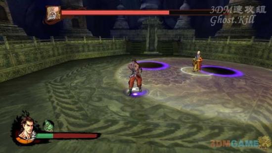 废掉方丈一定的血量后他的身边会出现原阵,阵里有两个紫色区域,不要站进去,在里面呆上两秒就会被他的超杀打飞,跑不了防不住。