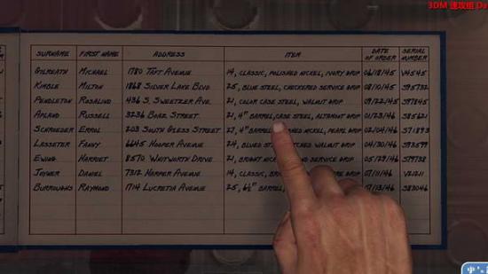 查看账本!凭着刚刚捡到的枪的型号,找到买家的地址(在ITEM这项27.4“那个就是了,用手指头对准就可以)