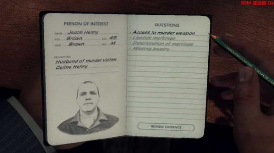 之后就可以审问了!以上图的顺序:3-1-3 第一个问题用(HusBAND's alibi) 第三个问题(Death threat note)指证