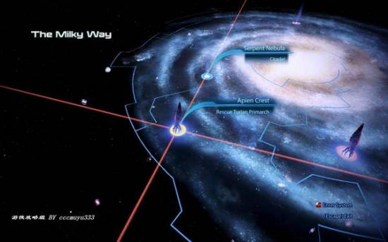 1:来到指挥室启动星云地图,找到目的地:palaven's moon(就在serpent nebula内),进入之后找到这个星球。显然这里收割者和图锐恩的战斗正在如火如荼之中,图锐恩也是只能在地面上顽强抵抗。(舰队神马的在外太空碰到收割者都是浮云·······)
