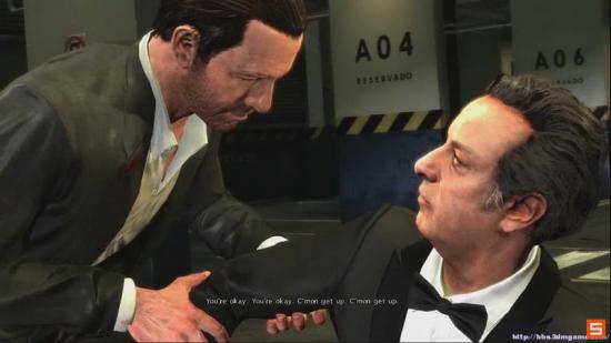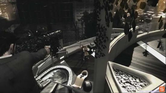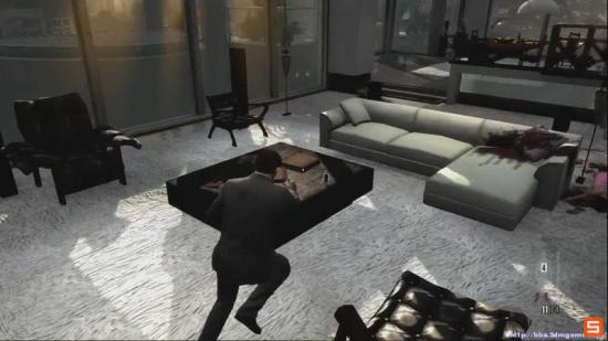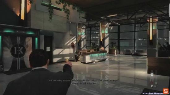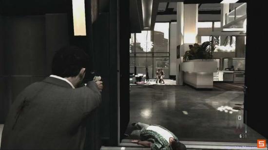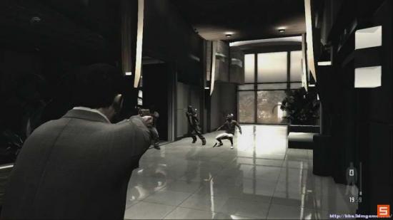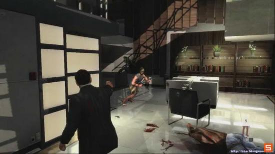 技巧提示: 在走到这里的同时 把视角提前调整到敌人的大概位置 迅速瞄准 并开启Bullet Time(子弹时间)如果操作熟练的话 完全可以在敌人跑开前 全部消灭