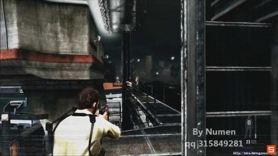 台阶下面 敌人一大把 开子弹时间 快速爆头 这里敌人很爱丢手雷 注意躲避