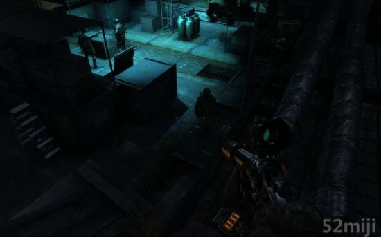 到达宿舍后首先从最右敌人开始逐一解决,打开大门后关闭电闸开关,从右侧阴暗处前进等待吊机的两名敌人把灯关闭