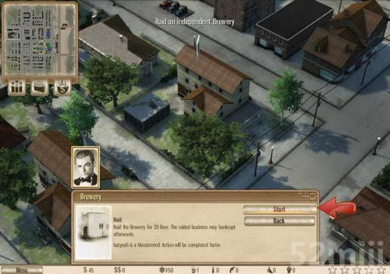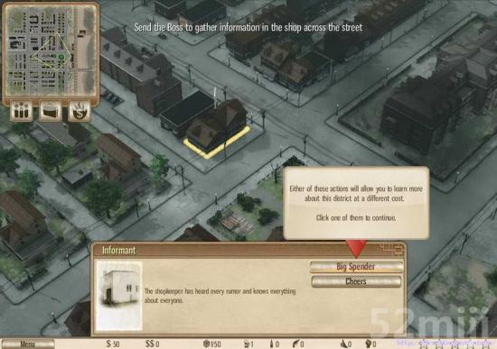 第一关还是以教学为主。游戏中新的建筑物的发现是通过INFORMANT 告密者 这个建筑物来获取的。玩家需要派遣你的手下或者你本人亲自来到此处进行互动,点击BIG SPENDER可以来与该建筑物互动得到相关的信息