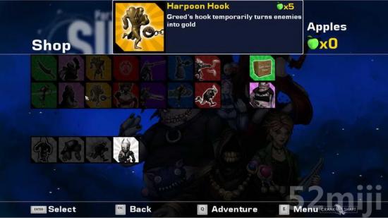 每个关卡获得的道具主要为绿色和红色的苹果。红色苹果为角色补血,而绿色则是类似于金币的购买类道具,每个关卡通关之后获得的绿苹果,可以在商店购买增加人物角色和特殊模块的商品