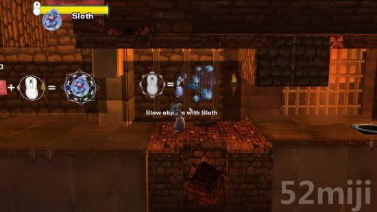 而还有一个比较隐藏的该技能用途,那就是SLOTH的技能击中水晶球后,可以让其在外力推动下(如下层机关弹射或者风扇气流吹拂),顺着作用力方向而顺势漂浮。这个技巧在后面是极其关键的。玩家可以通过利用水晶球使其一定时间内悬浮,然后取消减缓效果让其再下落,从而可以在远处操控该物件的具体落点来达到开启机关的效果